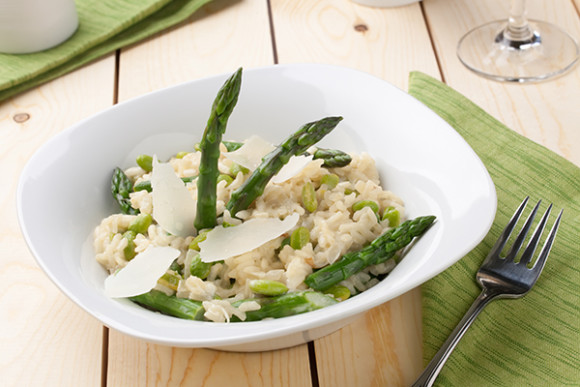 Ajouter les queues d’asperges émincées et les champignons, assaisonner et terminer avec le Baume de Bouteville, le beurre et le parmesan râpé. Réchauffer ensuite les pointes d’asperges dans un peu d’huile d’olive.Servir rapidement avec quelques copeaux de parmesan et des herbes fraîches.